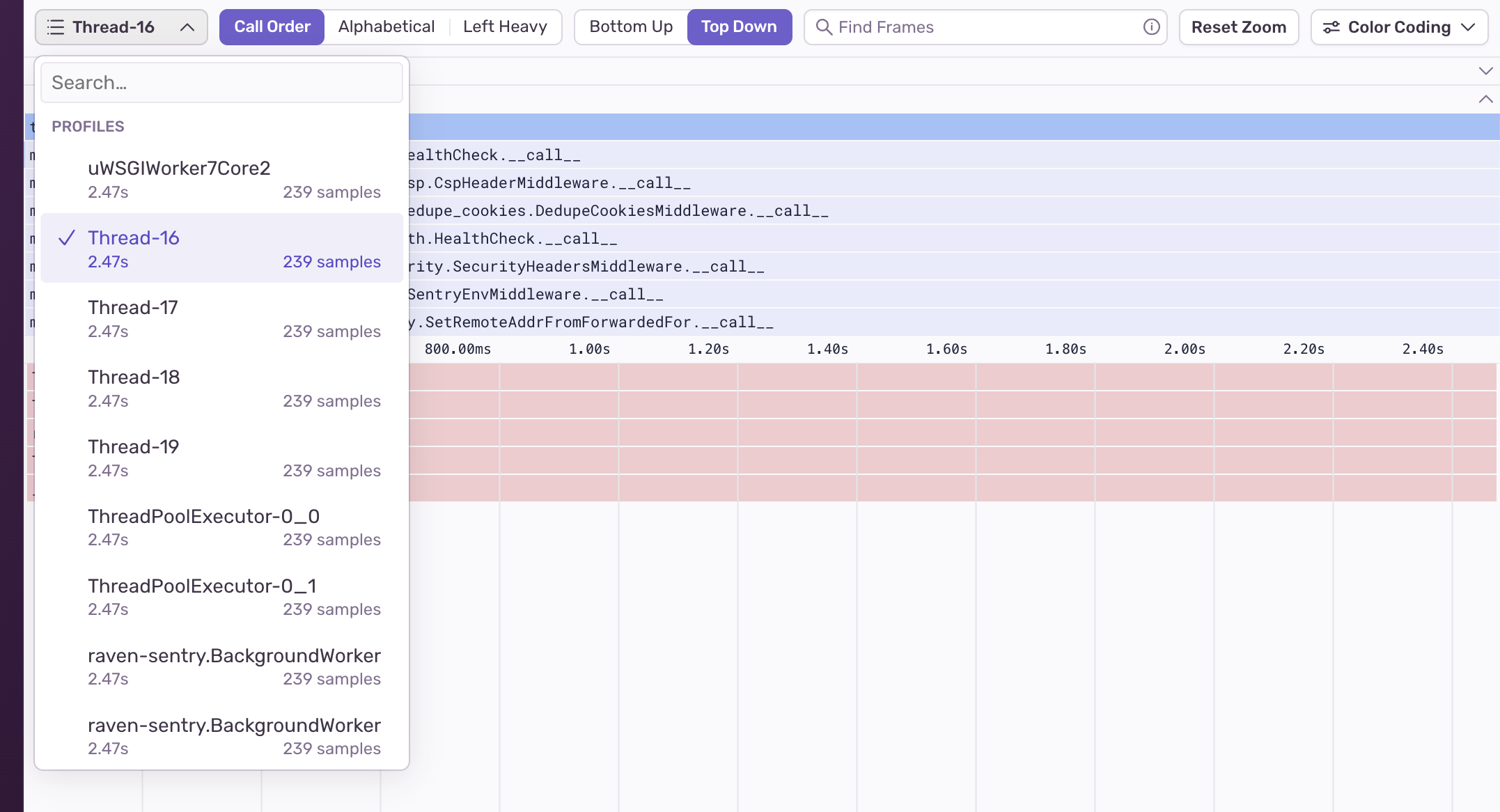 The Color Coding toggle offers different ways to color the flame graph: