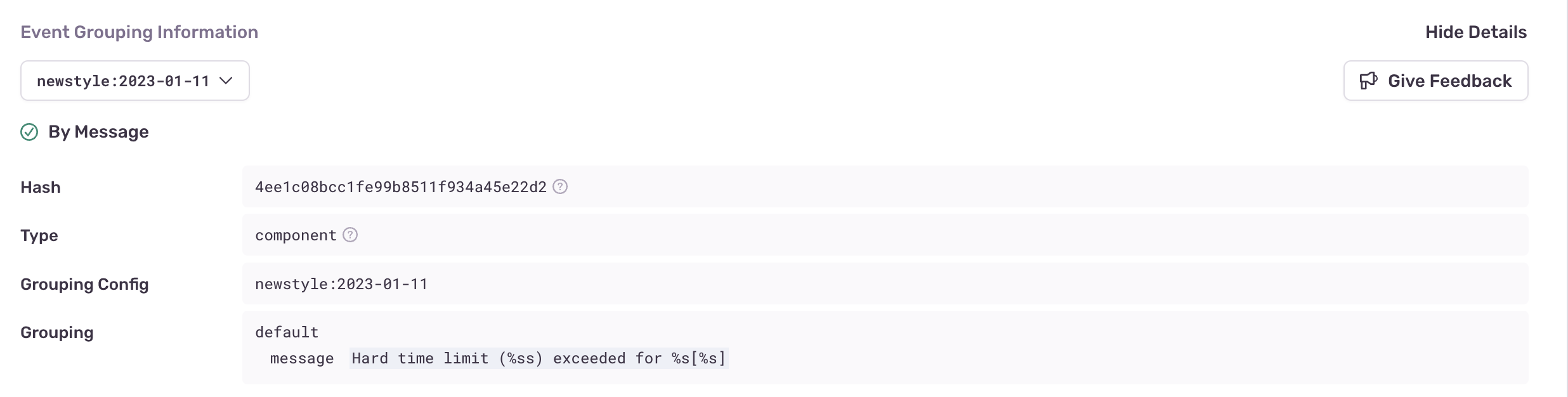 The "Event Grouping Information" section provides details of how Sentry fingerprinted the event into the group. You can see which parts of the stack trace contributed to the fingerprint as well as all values that were available. You can also use the "Grouping Config" dropdown to experiment with other grouping algorithms.
