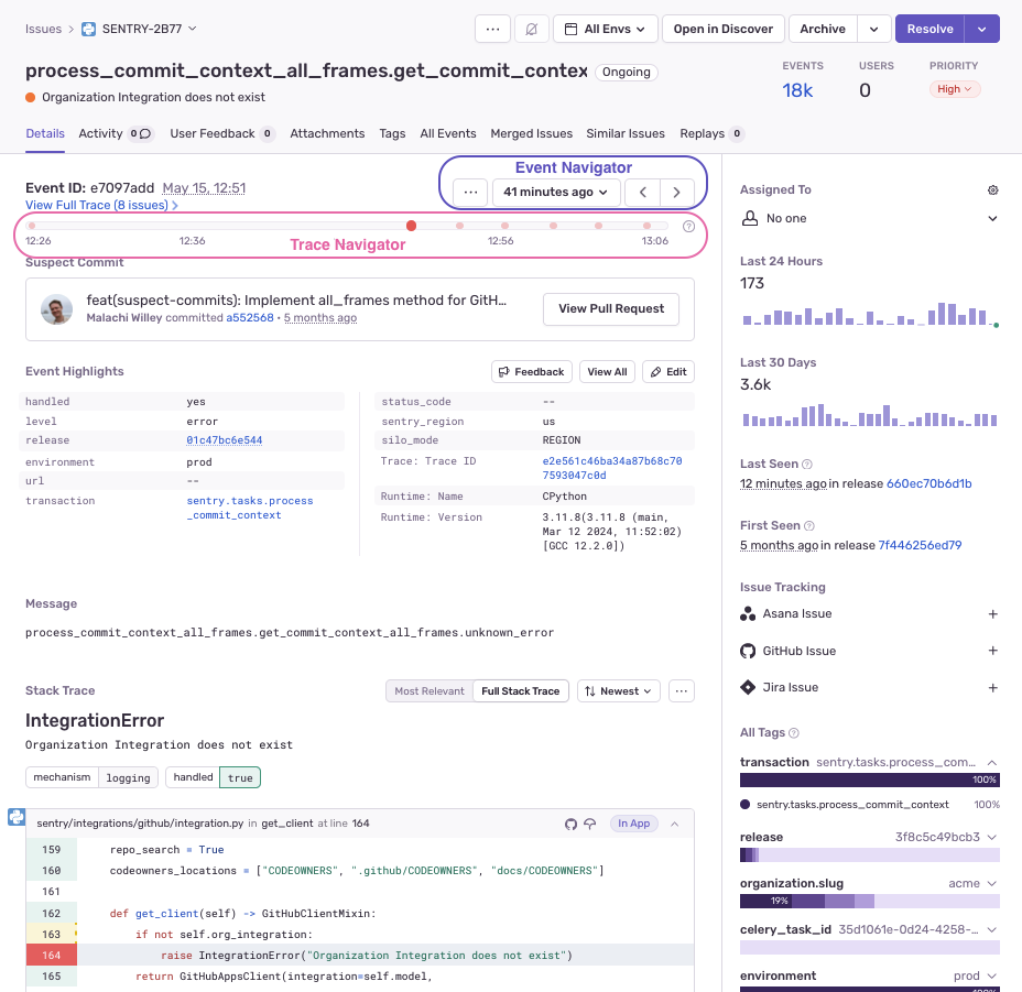 In the right hand sidebar, sentry.io reflects a summary that includes information such as how often the error issue has occurred in the last 24 hours and the last 30 days, as well as the last time and the first time the issue was seen. If the issue is linked to any GitHub or Jira issues, that's displayed here as well. You can also use this section to link to existing GitHub or Jira issues. Learn more about linking issues in Integrations. Lastly, there is a facet map, which shows the distribution of values for the tags for all events included in the error issue. All of these values are based on the environment that you've selected in the environment dropdown.